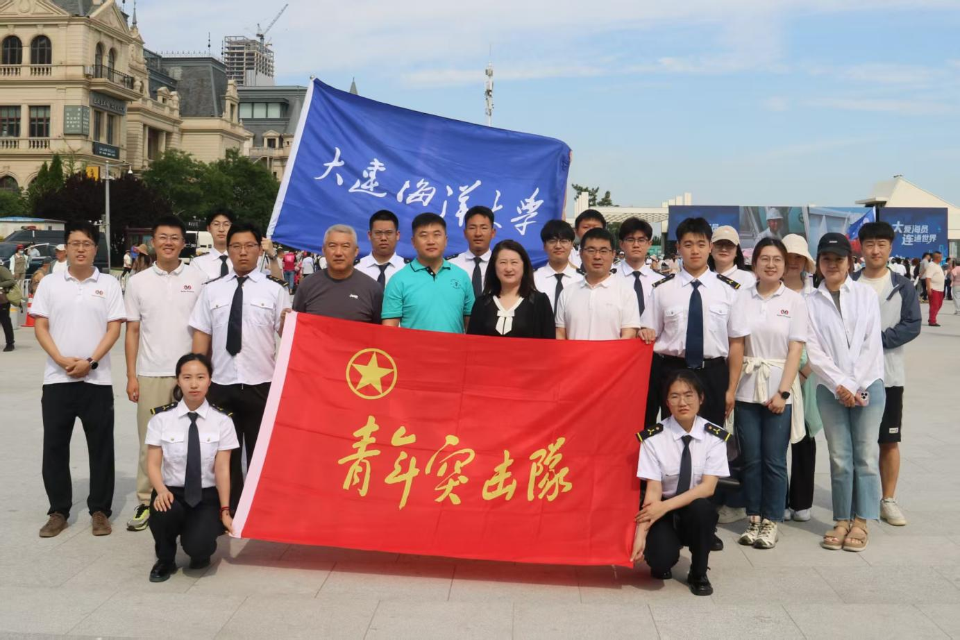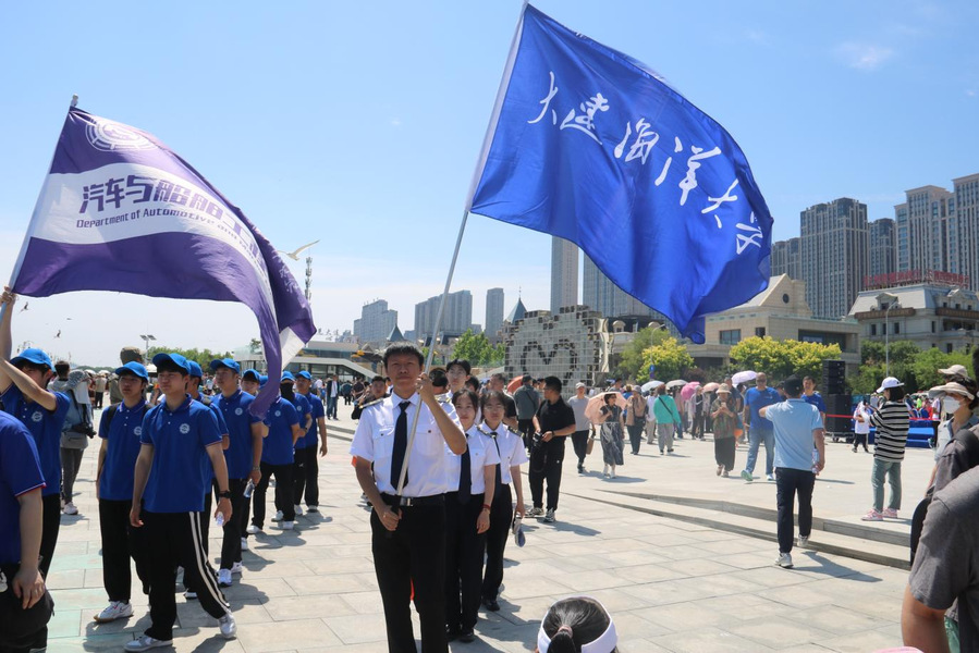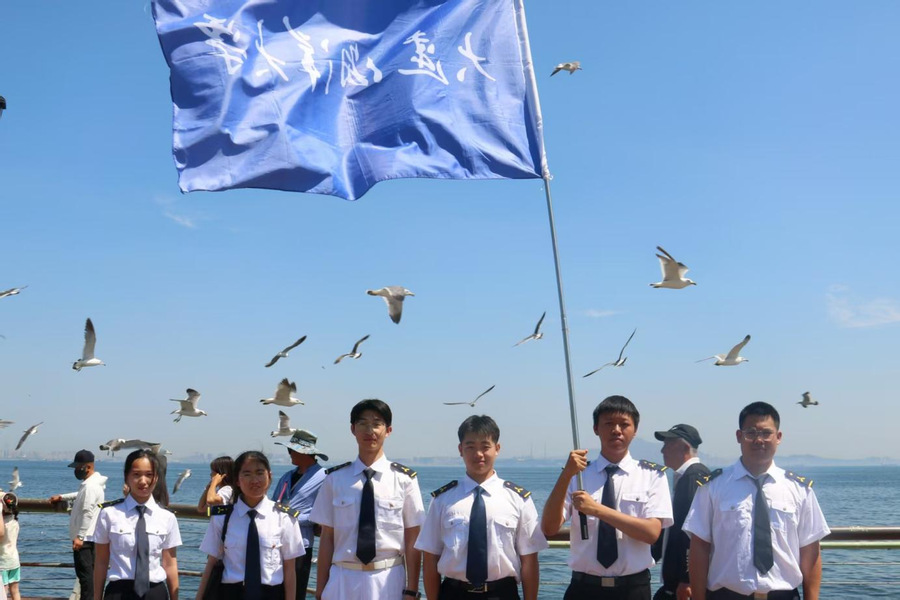 活动现场,学院青年突击队队员们的身影格外引人注目。他们身着统一航海服,以饱满的热情投身到活动的各个环节中。活动伊始,学院师生代表与大连华洋海事有限公司工作人员齐聚一堂,认真聆听海员代表的精彩致辞。海员代表以自身丰富的航海经历讲述航海途中的挑战与荣耀,赢得现场阵阵热烈掌声。致辞结束后,备受瞩目的船队展示环节拉开帷幕。大型省际客滚船“吉龙岛”轮、“永兴岛”轮、海事执法船“海巡 0301”轮、航标工作船“海巡 1506”轮以及大连海事大学实习船“育鲲”轮依次破浪驶过港东五街海域。庞大的船体在海面上气势磅礴地前行,壮观的景象吸引现场观众纷纷移步海边观赏。随后,授旗仪式在主持人饱含深情地引言中庄严举行,海员代表郑重接过象征使命与传承的旗帜,并高高挥舞致意,仪式现场氛围庄重而热烈。