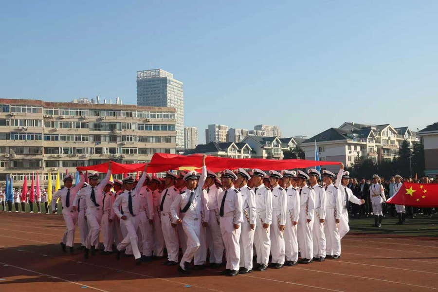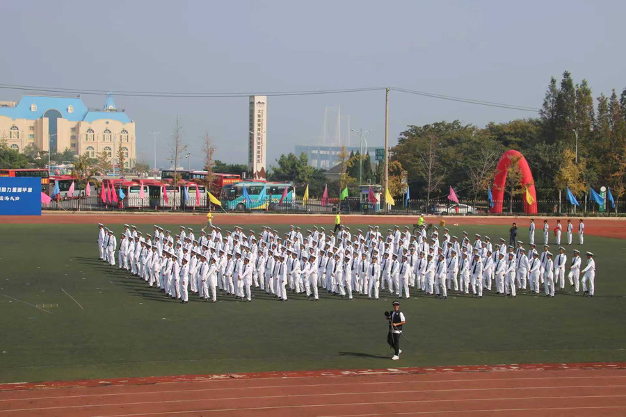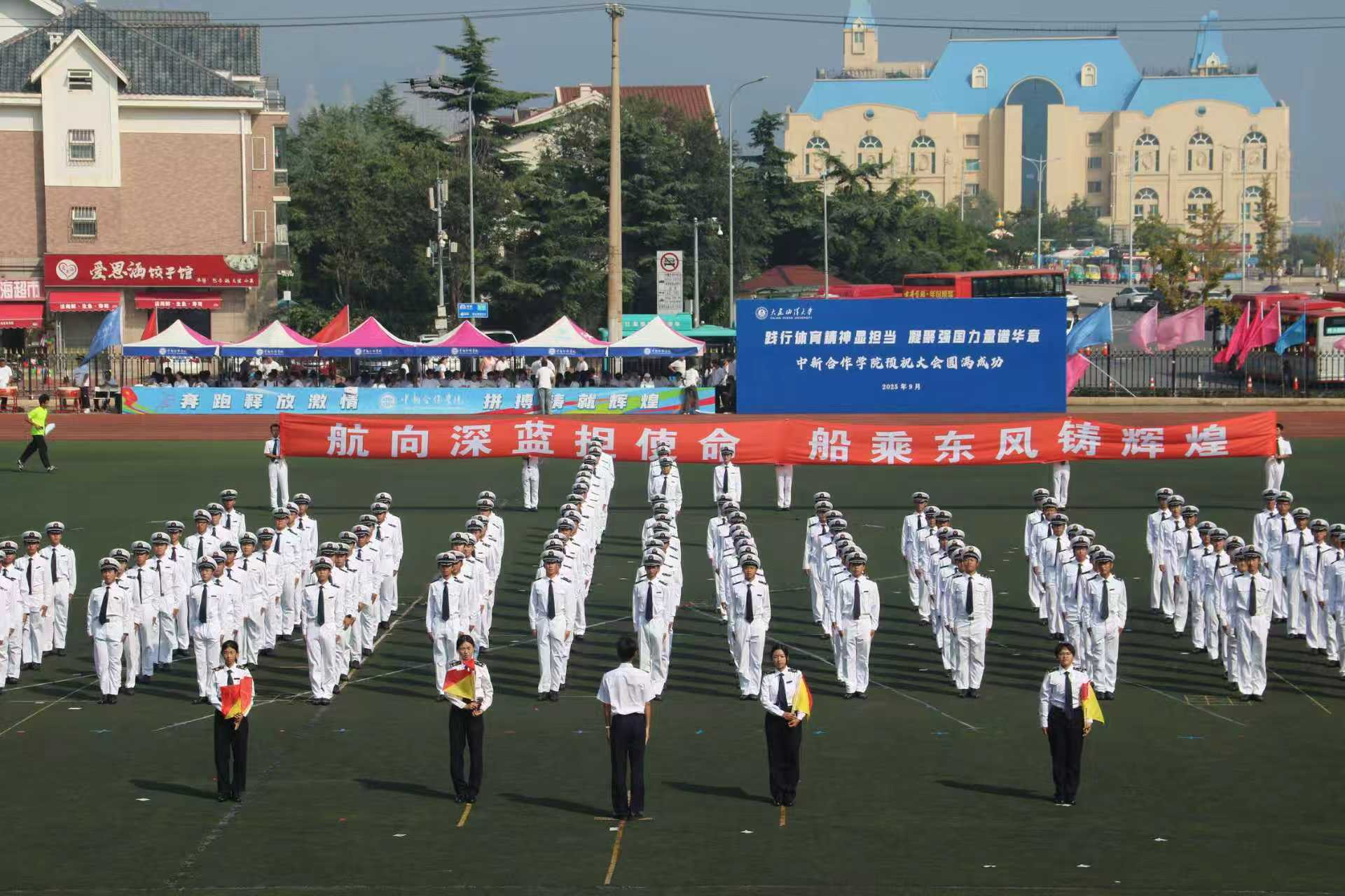 公司“海之魂”团体操展演方队更添亮色。学子们动作整齐划一、遒劲有力,尽显准军事化管理的严谨作风——这正是学院依托航海专业特色培养学子纪律意识的生动体现。“请党放心,强国有我”的口号响彻云霄,喊出了航船学子爱党爱国、挺膺担当的坚定信念;随后,“我爱DLOU”“信念坚定,风雨同舟,勇往直前,甘于奉献”的旗语展示次第展开,旗帜在空中划出优美弧线,既呼应了海洋与船舶的专业符号,更生动诠释了航船人扎根深蓝、服务国家的家国情怀。