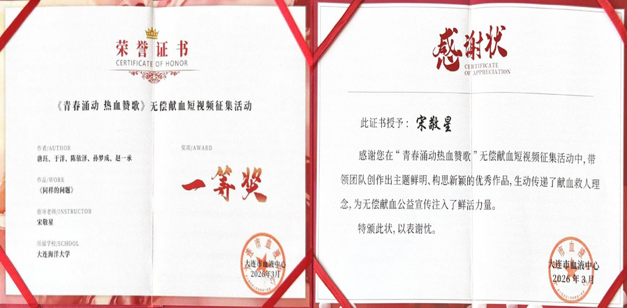 近日,由大连市卫生健康委、大连市委教育工委、共青团大连市委员会、大连市红十字会及大连市献血办联合主办的“青春涌动 热血赞歌”无偿献血短视频征集活动圆满落幕。公司参赛作品《同样的问题》在大连众多高校作品中脱颖而出,斩获一等奖和优秀组织奖。4月9日,颁奖仪式在大连市血液中心6楼学术报告厅举行,指导教师宋敬星、员工代表陈依泽参加。